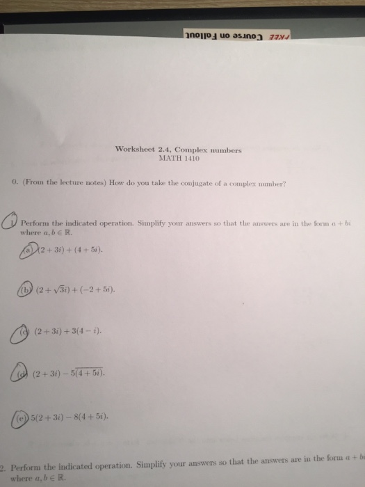 Solved Worksheet 2 4 Complex Numbers Math 1410 0 From