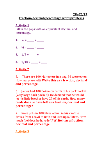 Fraction Decimal Percentage Word Problems Teaching Resources