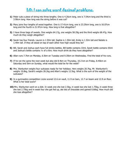 Decimal Word Problems Teaching Resources