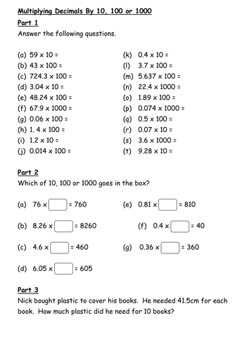 Multiplying And Dividing Decimals By 10 100 And 1000 Worksheets