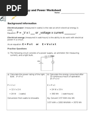 Electrical Energy And Power Worksheet Kilowatt Hour Watt